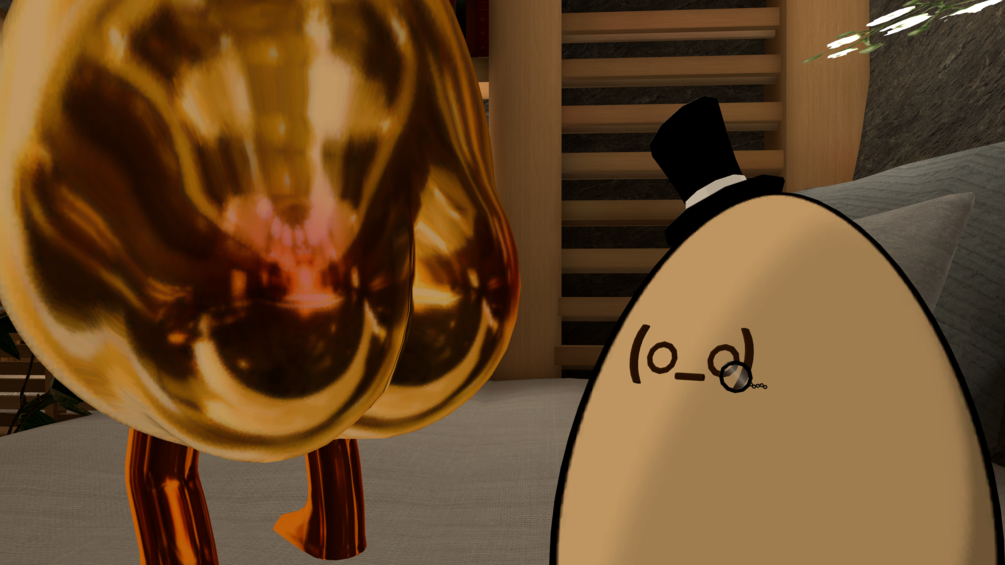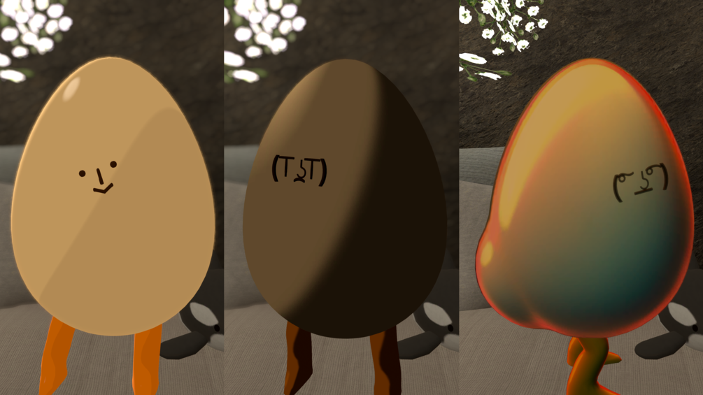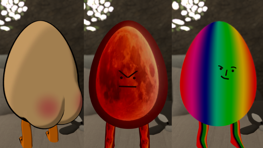 Born from a single idea of an egg packing toggleable cake, Eggwardo is a simple lil guy with some material swaps, a monocle, a hat and not one but two different faces with matching expressions! You can swap to the other whenever you like and he'll keep the expression you're making! He also packs GoGo Loco Beyond, allowing him to ascend and lord over all.
